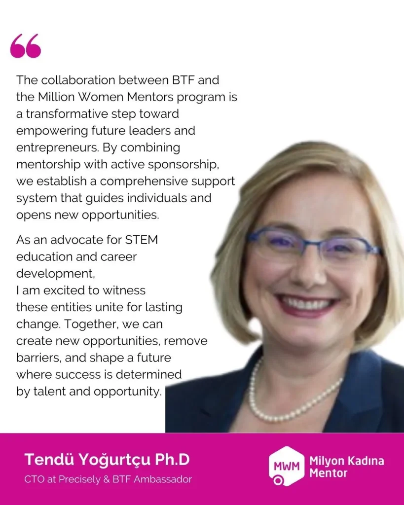 The Milyon Kadına Mentor (Million Women Mentors – MWM) program is a groundbreaking mentorship initiative that connects young women (ages 15-25) with industry leaders to help them achieve their career goals. Launched in 2021 to support careers in STEM, the program expanded in 2023 to include all fields of study—welcoming high school students, university students, and recent graduates.